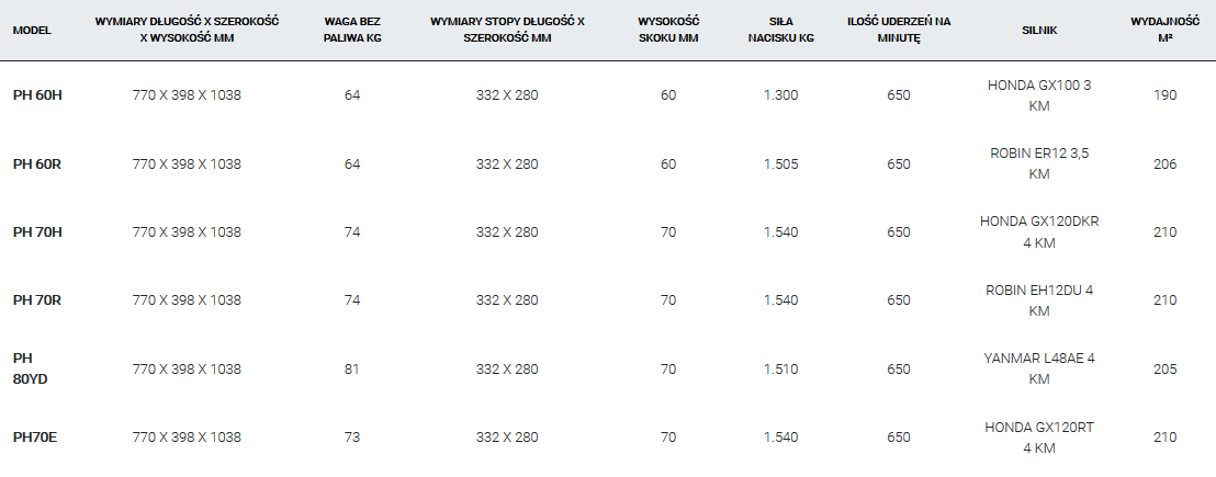 Zapraszamy do zapoznania się z gamą skoczków, w zakresie wagowym od 64 do 81kg, sile uderzenia od 1300 do 1540kg i wydajności od 190 do 210m². Skoczki wyposażone są w innowacyjny trzy-strefowy filtr powietrza. Główne części nośne wykonane z wyjątkowo wytrzymałego, hartowanego aluminium. Częstotliwość, amplituda oraz siła uderzenia, dopasowane do ubijania różnego rodzaju gruntu.