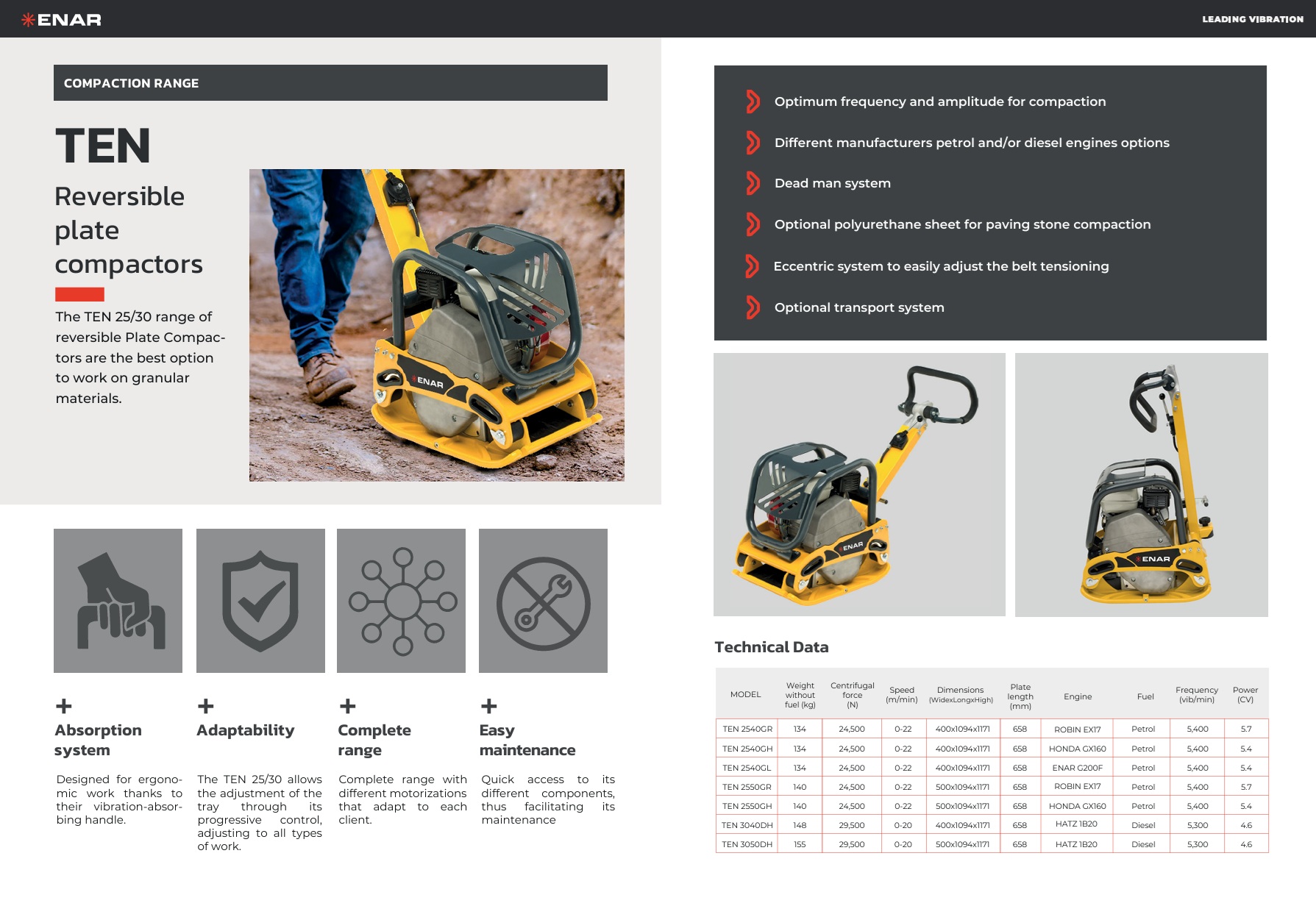 To zagęszczarki wyposażone w system hydrauliczny do zmiany kierunku jazdy. Wyposażone w silniki benzynowe lub Diesla. W zależności od potrzeb dostępne różne szerokości płyt.