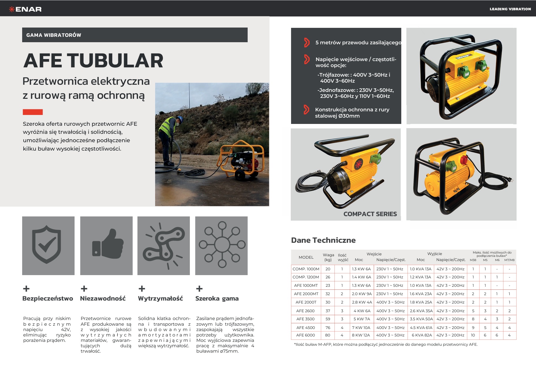 Przetwornice elektryczne w osłonie rurowej serii AFE składają się z modeli 1000, 2000, 2500, 3500, 4500 i 6000. Wszystkie wyposażone są w osłonę rurową, a w modelach 3500, 4500 i 6000 dodatkowo w wózek transportowy.