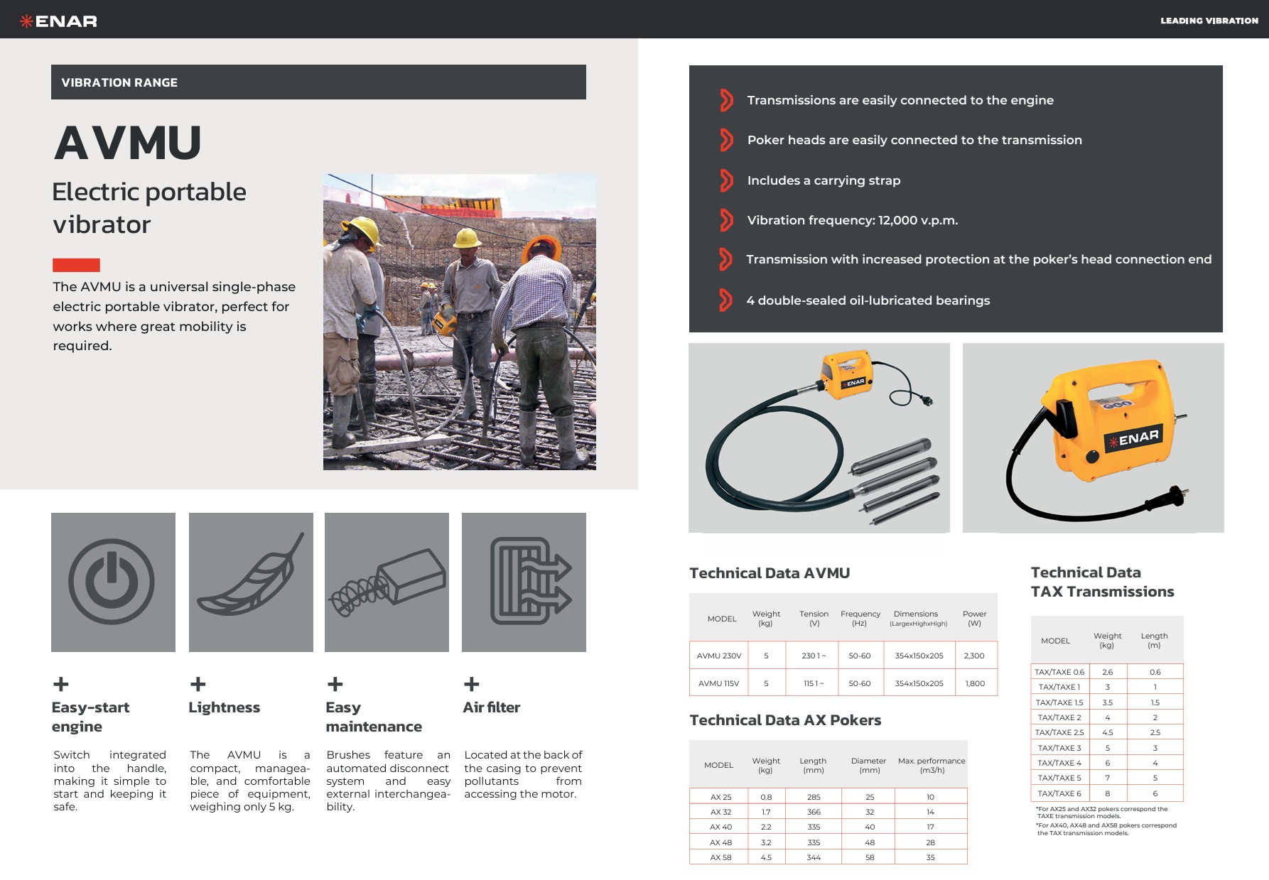 Wibrator wyposażony w napęd o niewielkiej wadzę 4,5kg. Wysoce wydajny, zdolny zawibrować do 35 m3/godz. betonu. Na wlocie powietrza filtr z pianki .